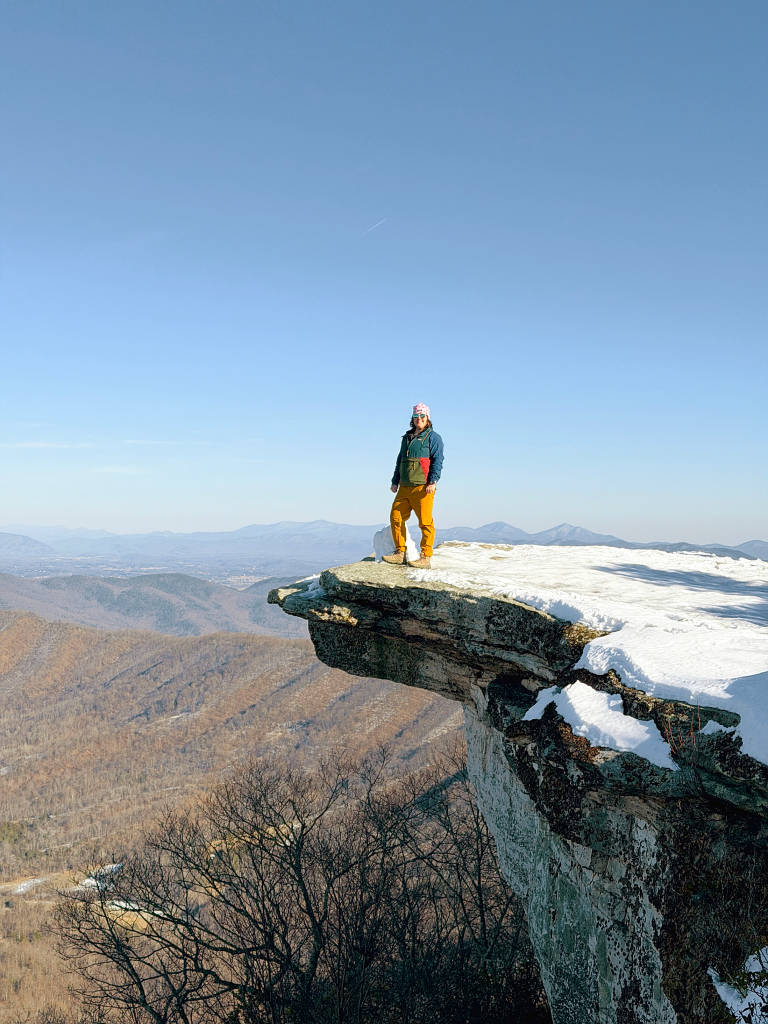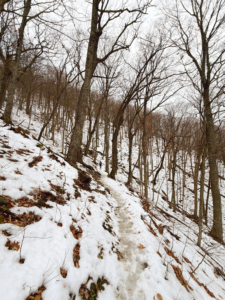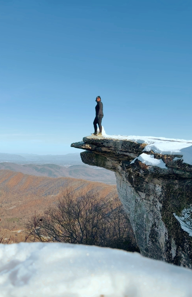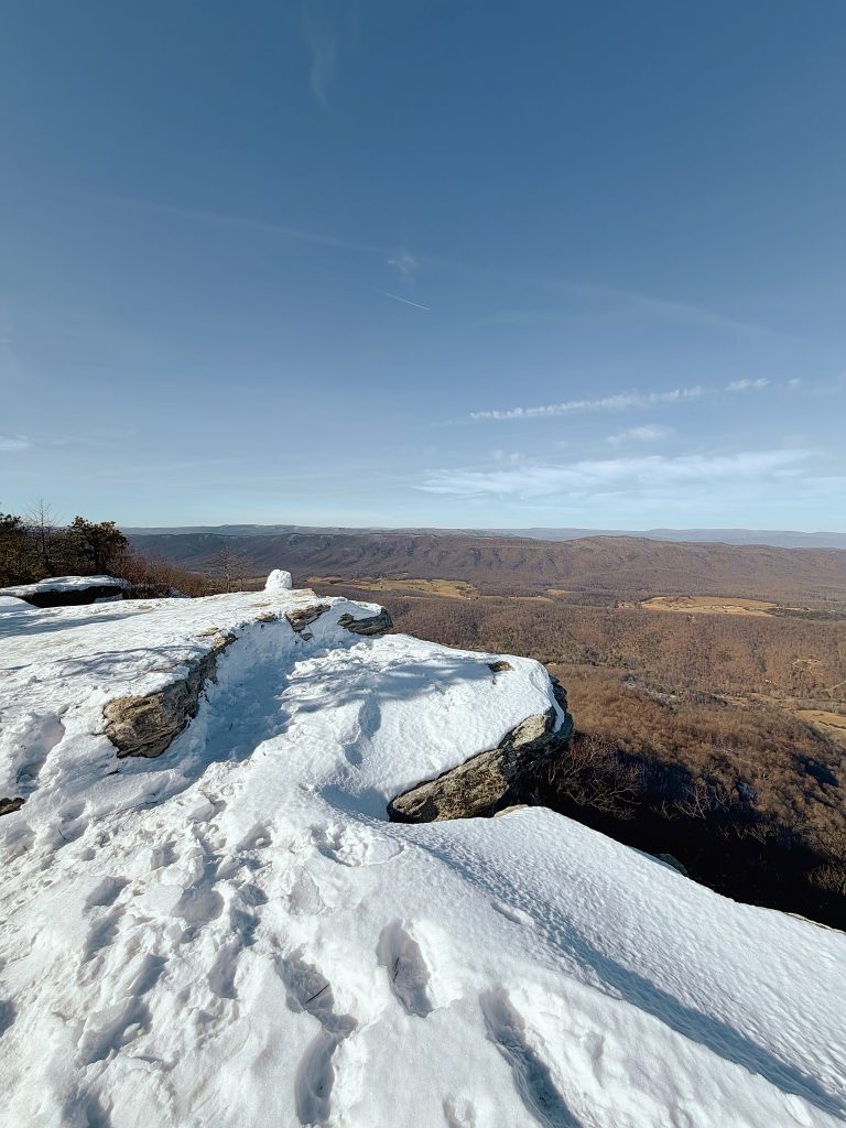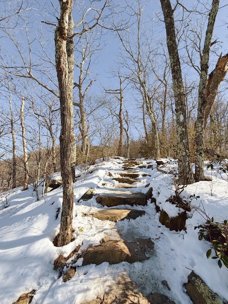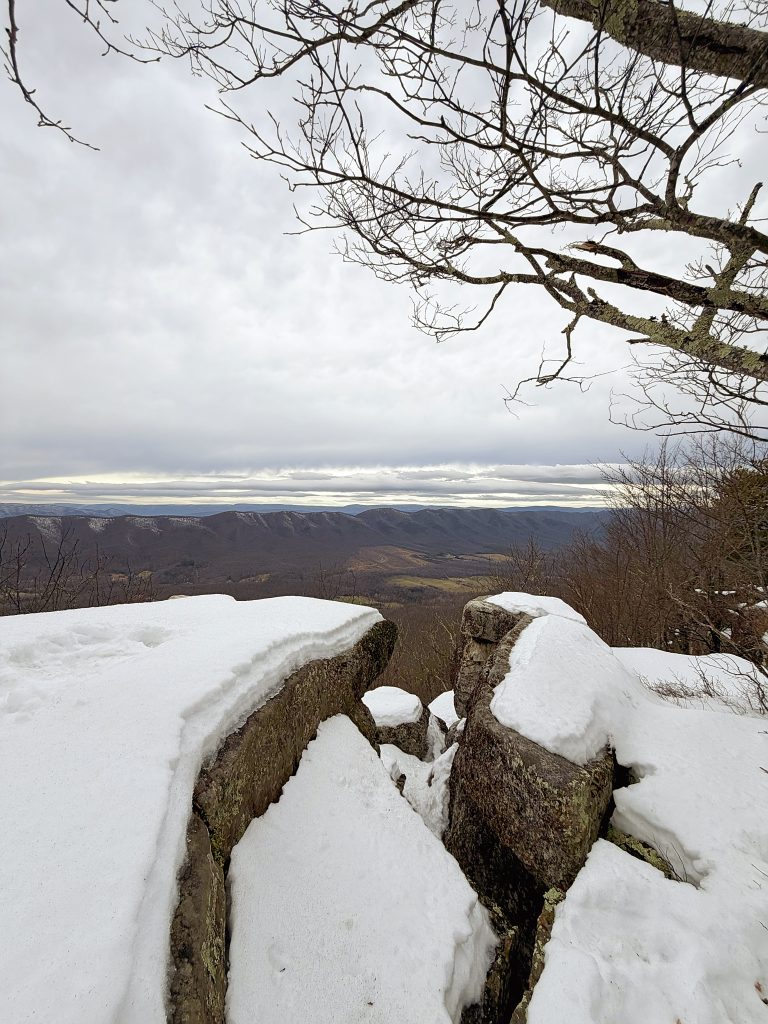 The summit, though, requires care — especially in winter. Snow fills crevices between rocks, and it’s hard to tell what’s solid and what’s hollow. Every step demands attention. The view stretches long and wide, quieter than McAfee Knob, and honestly… earned.