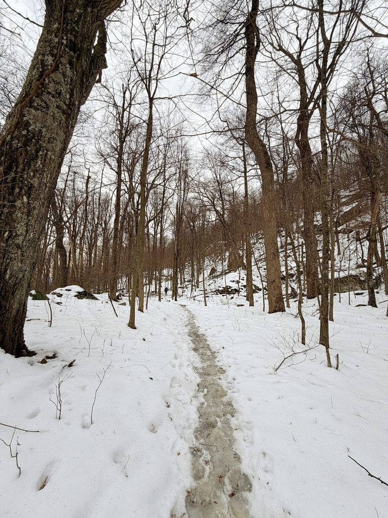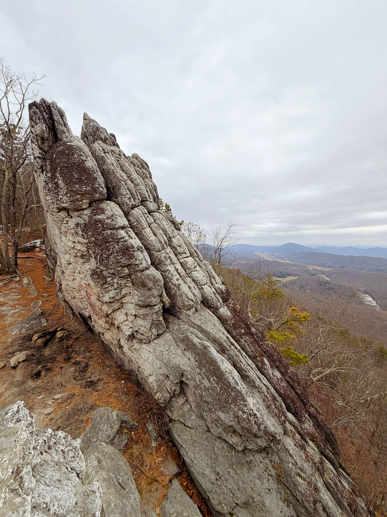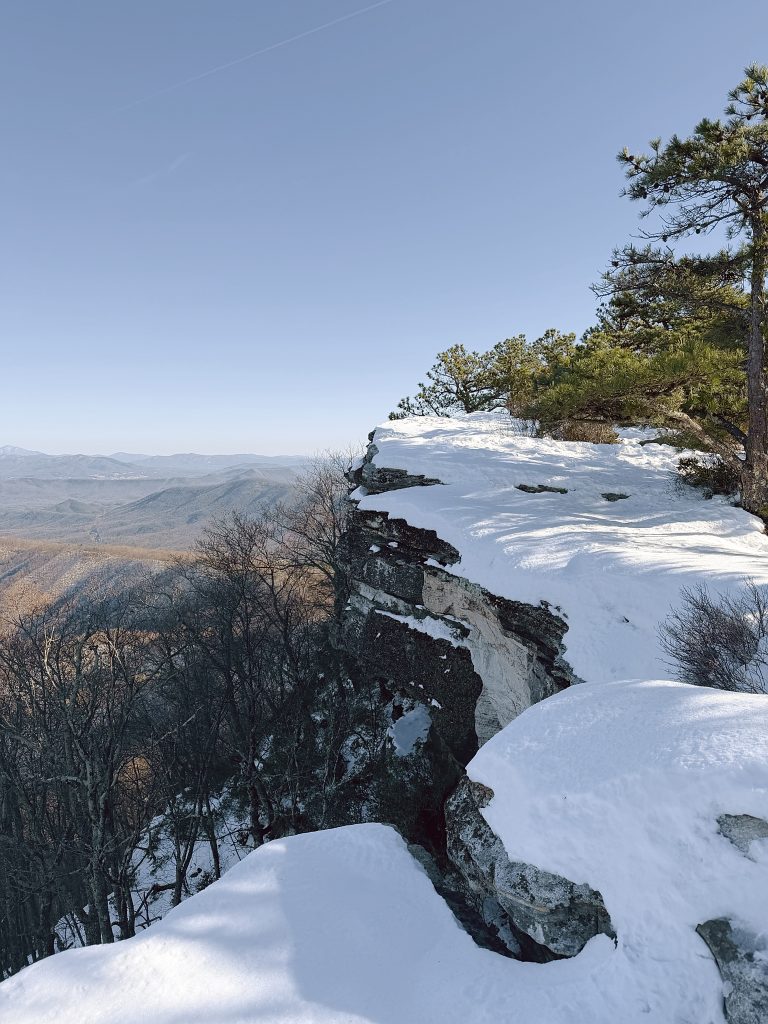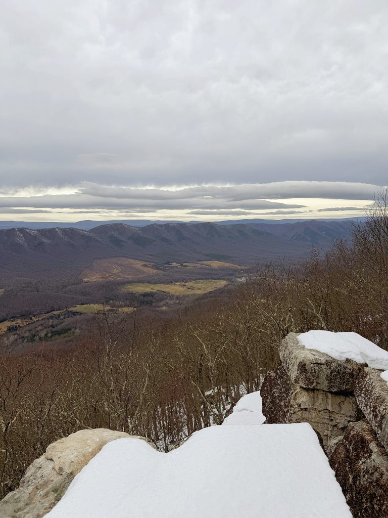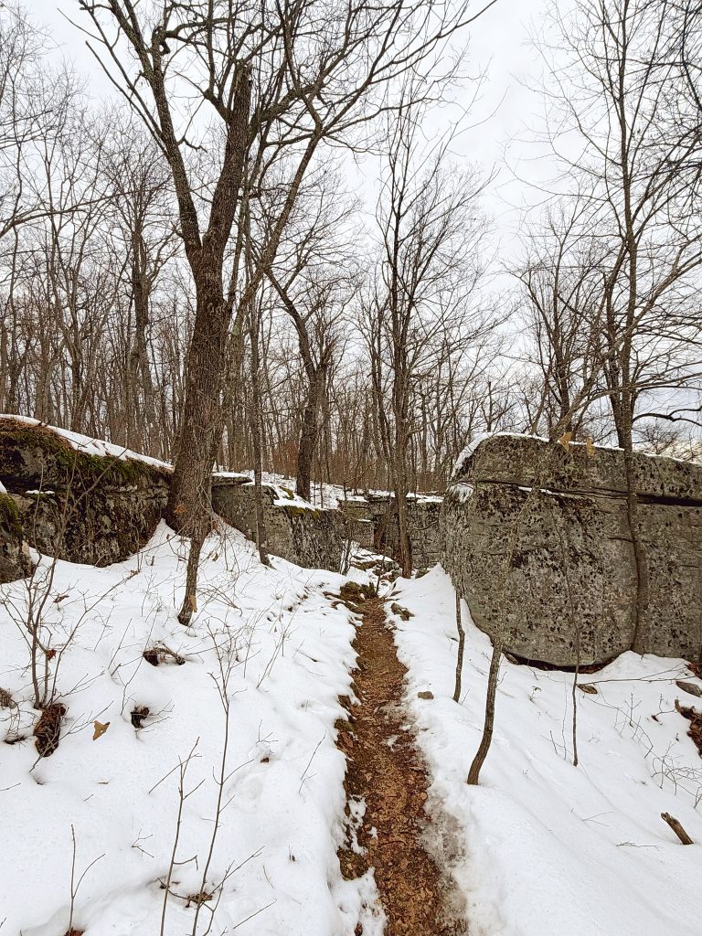 The summit, though, requires care — especially in winter. Snow fills crevices between rocks, and it’s hard to tell what’s solid and what’s hollow. Every step demands attention. The view stretches long and wide, quieter than McAfee Knob, and honestly… earned.