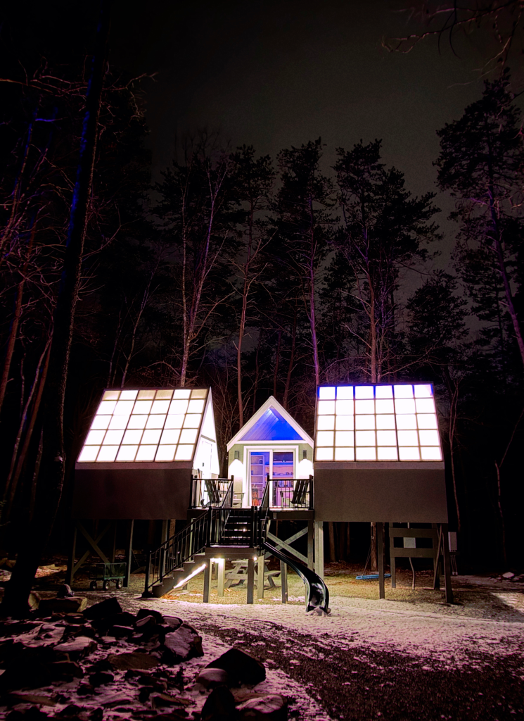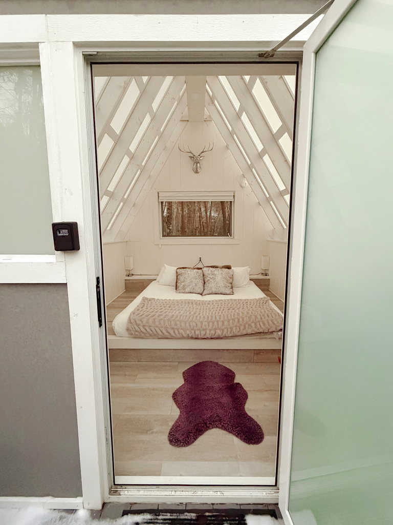 We stayed at Four Fillies, tucked along a river in the woods, in their dreamy Glo Haus cabin. The entire property is a masterclass in intentional glamping — tiny-home-style cabins, converted western wagons, multi-bedroom cabins, all spaced thoughtfully along the river. Cozy, quiet, and exactly what tired hikers need at the end of winter days.